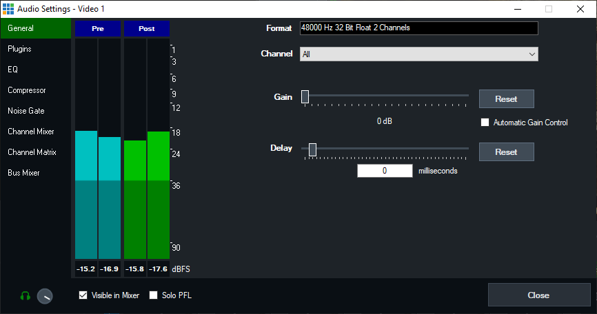 These audio meters can be used to monitor the audio audio at the pre-effects stage (for any effects, volume or gain, including delay)